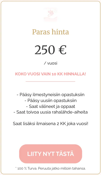 Hinta uusille tulijoille nousee portaittain lähiaikoina. Silti sinun osallistumismaksusi pysyy aina samana ja ennallaan. Toisin sanoen mitä varhaisemmassa vaiheessa tulet mukaan, sitä edullisemmalla saat kaikki nykyiset JA tulevat ohjaukset, apuvälineet ja tuen jäsenalueella.