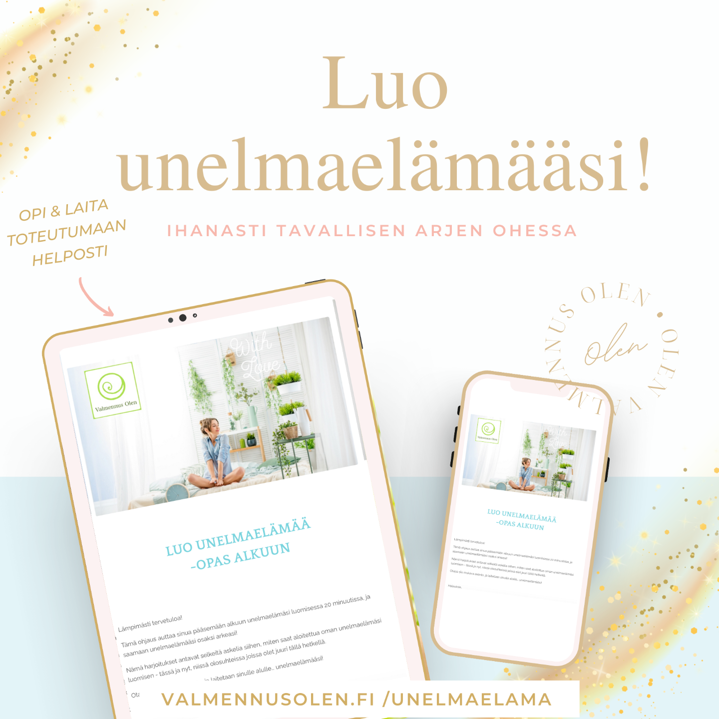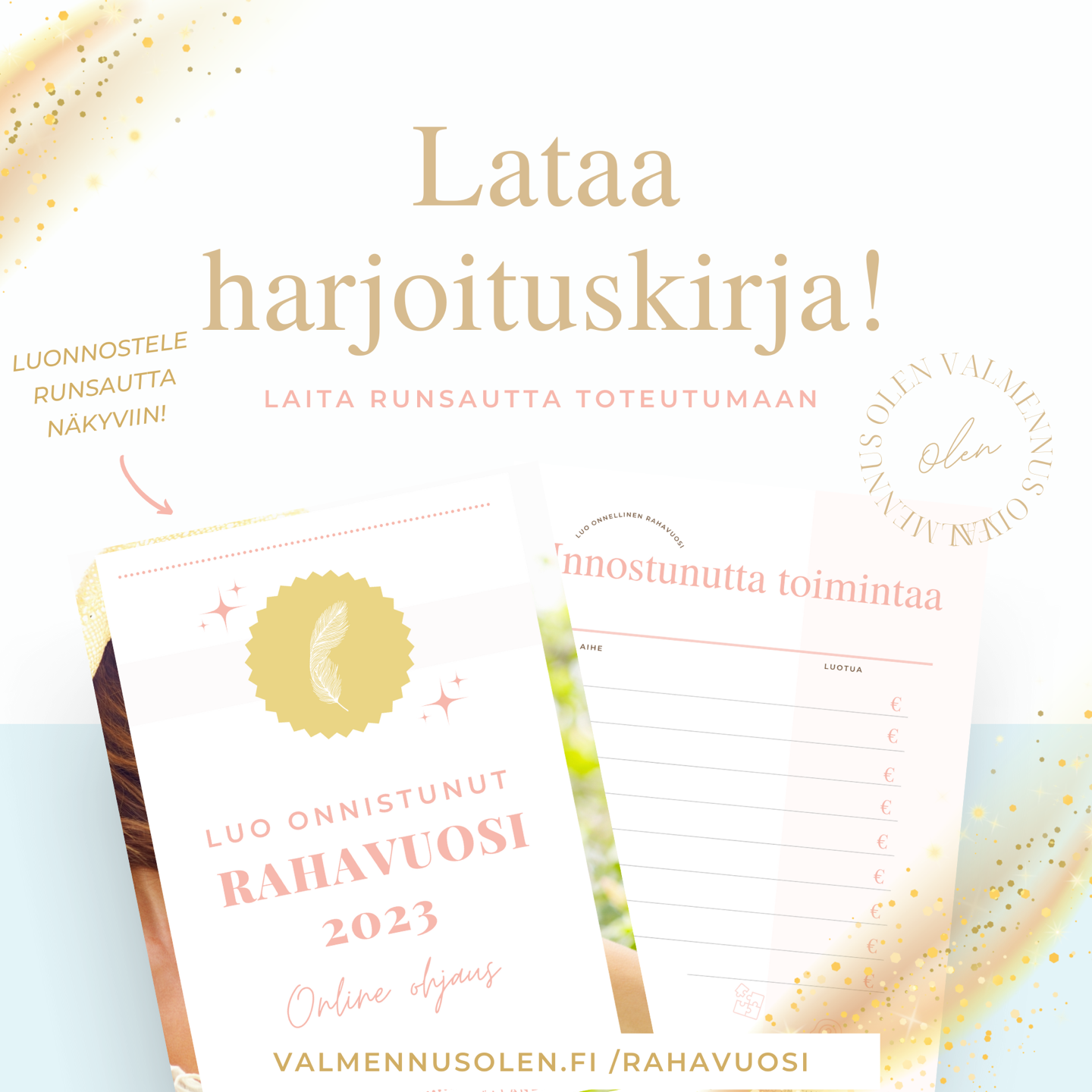 Olen luonut sinulle käytännöllisen ja toimivan valmiin polun, jolla voit saada runsautta ja rahalähteitä toteutumaan aivan tavallisen arjen ohessa - sekä apuvälineitä jotka tekevät siitä helppoa.